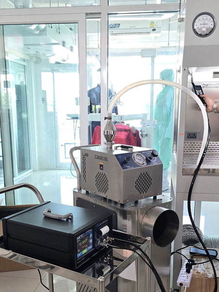 采用DOP(PAO)发生器在过滤器上游发尘,使用光度计检测过滤器上下游气溶胶浓度来判定过滤器是否有泄漏。发尘的目的是因高效过滤器上游尘粒浓度较低,仅用气溶胶光度计在不发尘的情况下检测,较难发现有泄漏,需补充发尘才能明显、容易地发现泄漏。